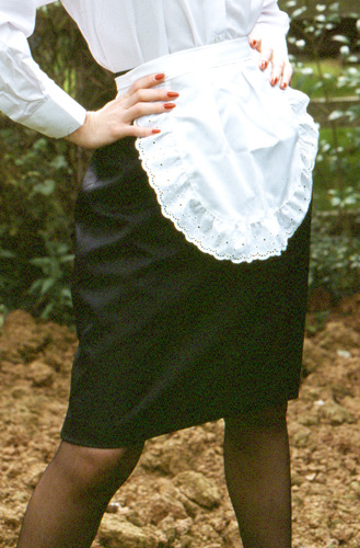 Apron with Anglais frills.(Please note that the cuved style is now discontinued and a square style will be sent instead)