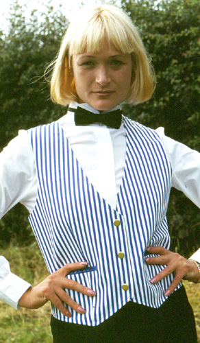 Womens blue striped waistcoat in 65% polyester/35% cotton. Gilt button fastening, contrast jetted pockets. Fully lined, self fabrick back.